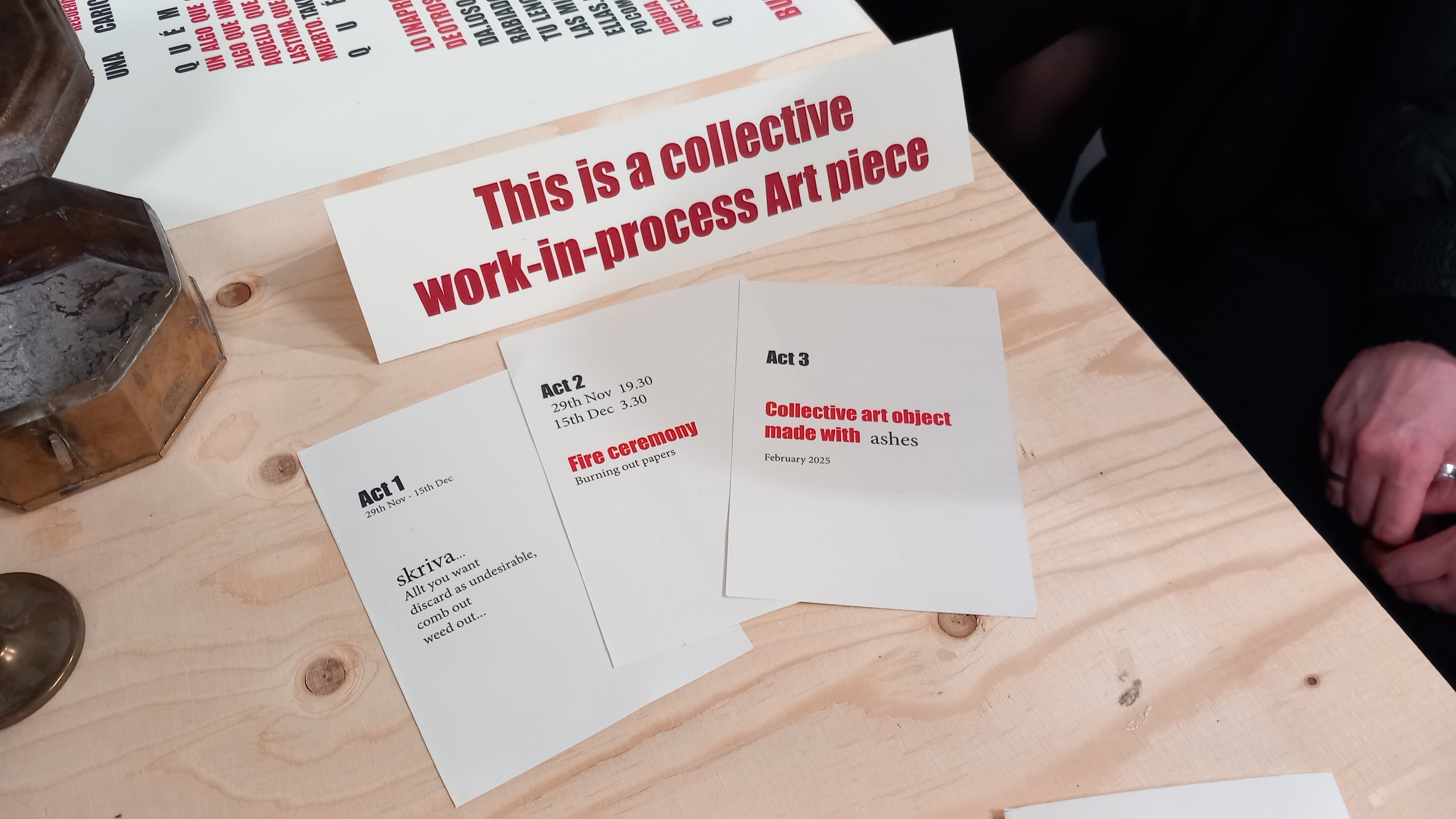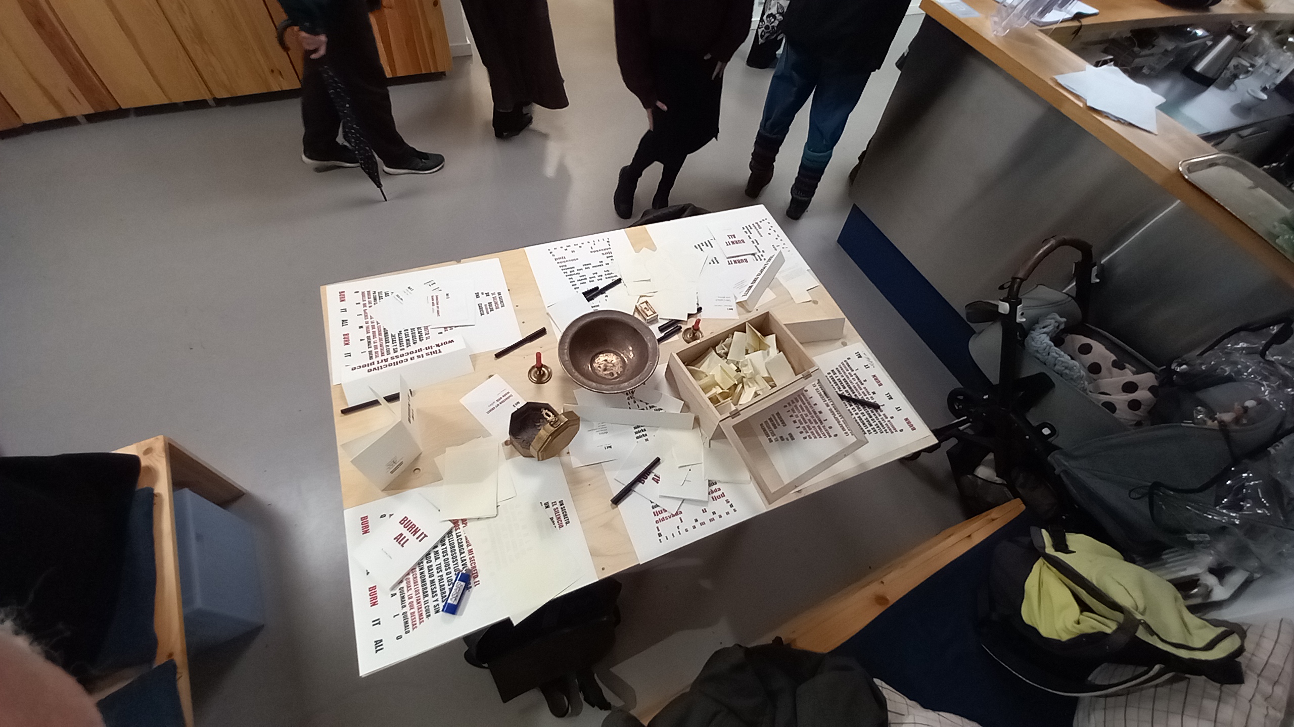In a collective agreement we set up the fire and burn the papers to ashes. Using the ash as a medium for creation, in the following months a new art object will be created.